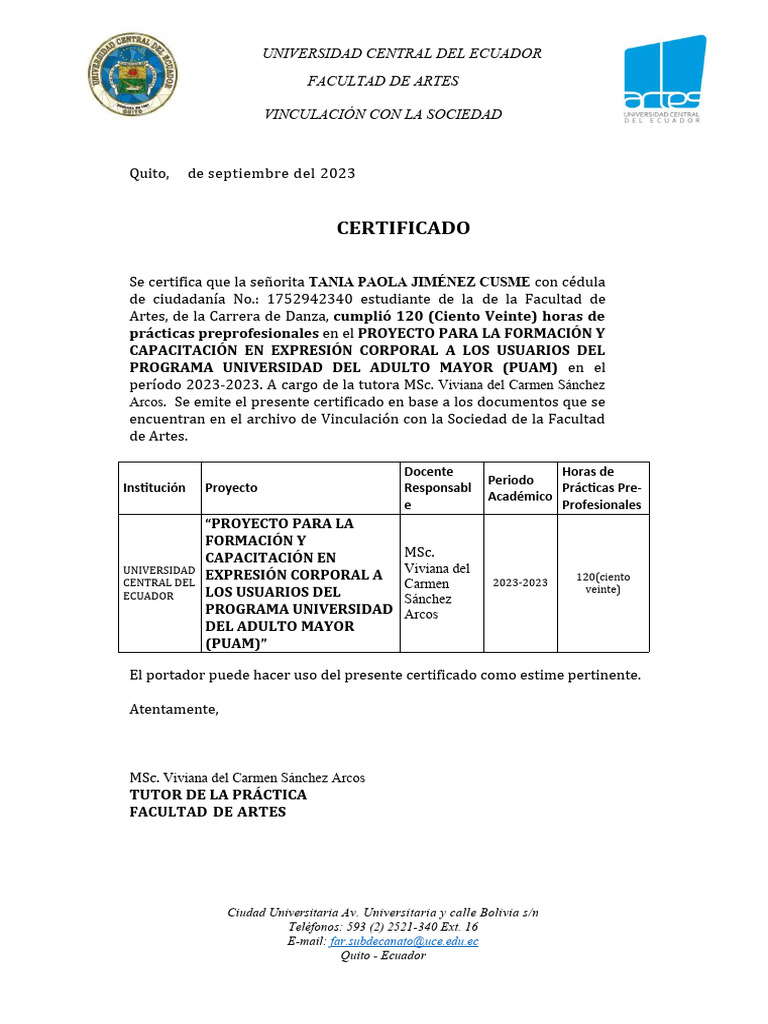 Se certifica que la señ orita TANIA PAOLA JIMÉNEZ CUSME con cédula