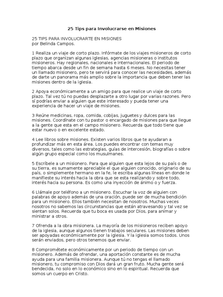 25 Tips para Involucrarse en Misiones 25 TIPS PARA INVOLUCRARTE EN MISIONES por Belinda Campos. 1 Realiza un viaje de corto plazo.
