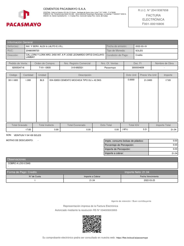 Señor(es): INV. Y SERV. ALEX & LALITO E.I.R.L. Fecha de emisión: 2022-03-19