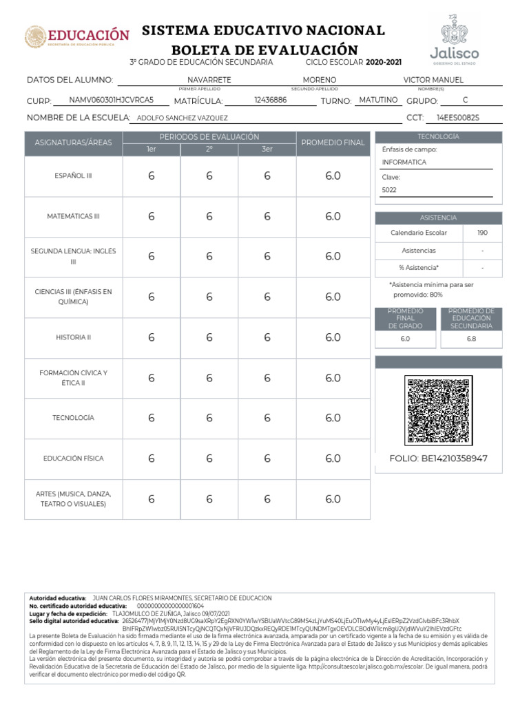 CURP: NAMV060301HJCVRCA5 MATRÍCULA: 12436886 TURNO: MATUTINO GRUPO: C