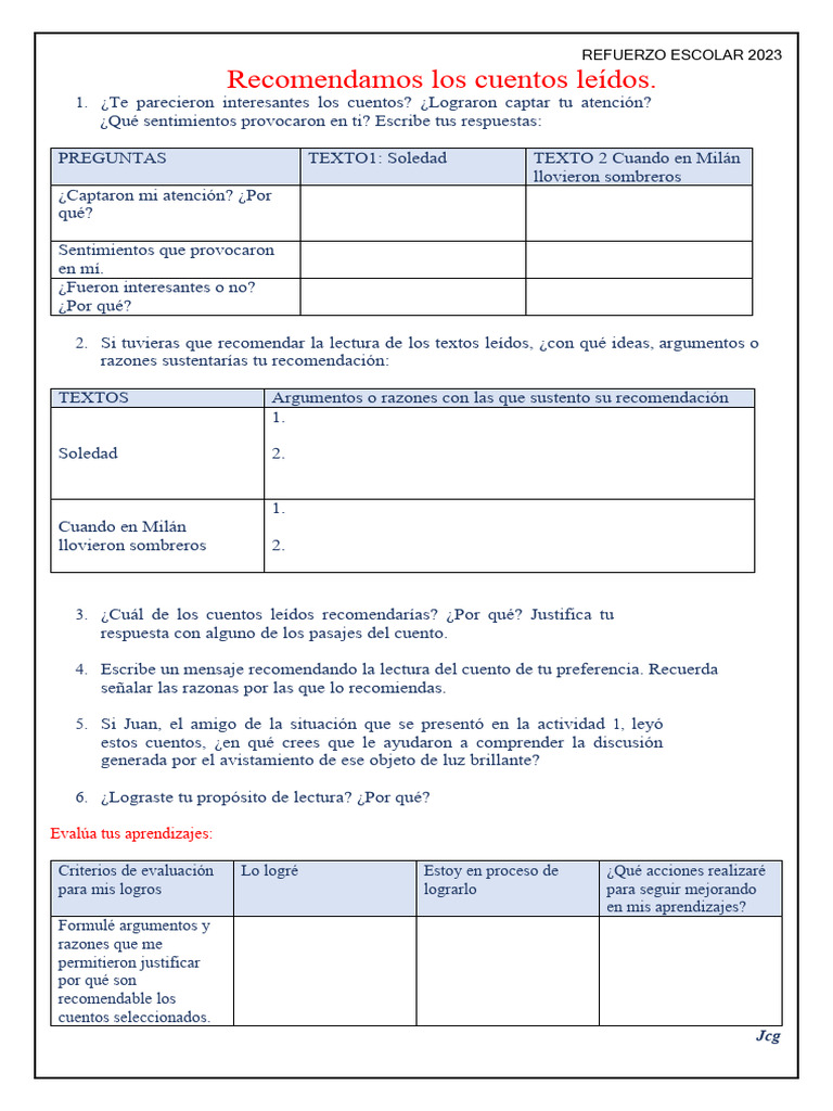 4. Escribe un mensaje recomendando la lectura del cuento de tu preferencia. Recuerda