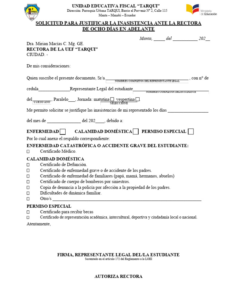 SOLICITUD PARA JUSTIFICAR LA INASISTENCIA ANTE LA RECTORA