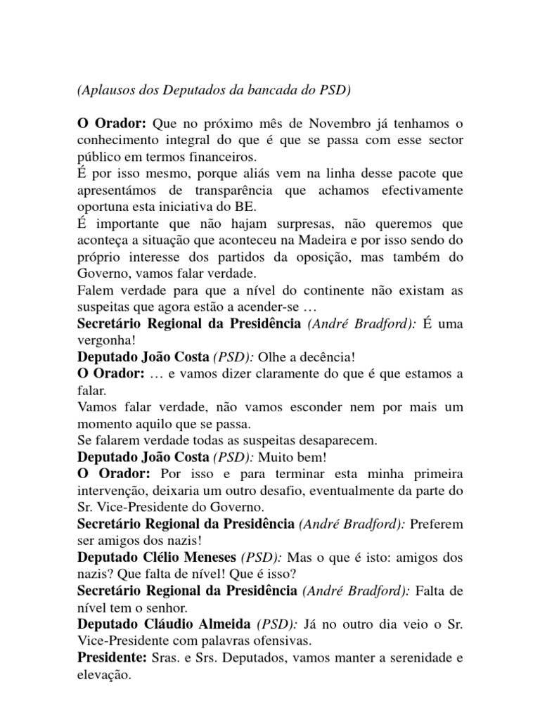 a com esse sector pblico em termos financeiros. por isso mesmo, porque alis vem na linha desse pacote que apresentmos de transparncia que achamos efectivamente oportuna esta iniciativa do BE. importante que no hajam surpresas, no queremos que acontea a situao que aconteceu na Madeira e por isso sendo do prprio interesse dos partidos da oposio, mas tambm do Governo, vamos falar verdade. Falem verdade para que a nvel do continente no existam as suspeitas que agora esto a acender-se Secretrio Regional da Presidncia (Andr Bradford): uma vergonha! Deputado Joo Costa (PSD): Olhe a decncia! O Orador: e vamos dizer claramente do que que estamos a falar. Vamos falar verdade, no vamos esconder nem por mais um momento aquilo que se passa. Se falarem verdade todas as suspeitas desaparecem. Deputado Joo Costa (PSD): Muito bem! O Orador: Por isso e para terminar esta minha primeira interveno, deixaria um outro desafio, eventualmente da parte do Sr. Vice-Presidente do Governo. Secretrio Regional da Presidncia (Andr Bradford): Preferem ser amigos dos nazis! Deputado Cllio Meneses (PSD): Mas o que isto: amigos dos nazis? Que falta de nvel! Que isso? Secretrio Regional da Presidncia (Andr Bradford): Falta de nvel tem o senhor. Deputado Cludio Almeida (PSD): J no outro dia veio o Sr. Vice-Presidente com palavras ofensivas. Presidente: Sras. e Srs. Deputados, vamos manter a serenidade e elevao.
