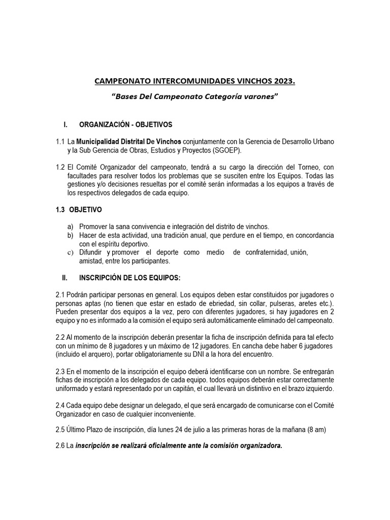 3.1 El torneo se llevará a cabo en el estadio Municipal del Distrito de Vinchos en 4 partidos