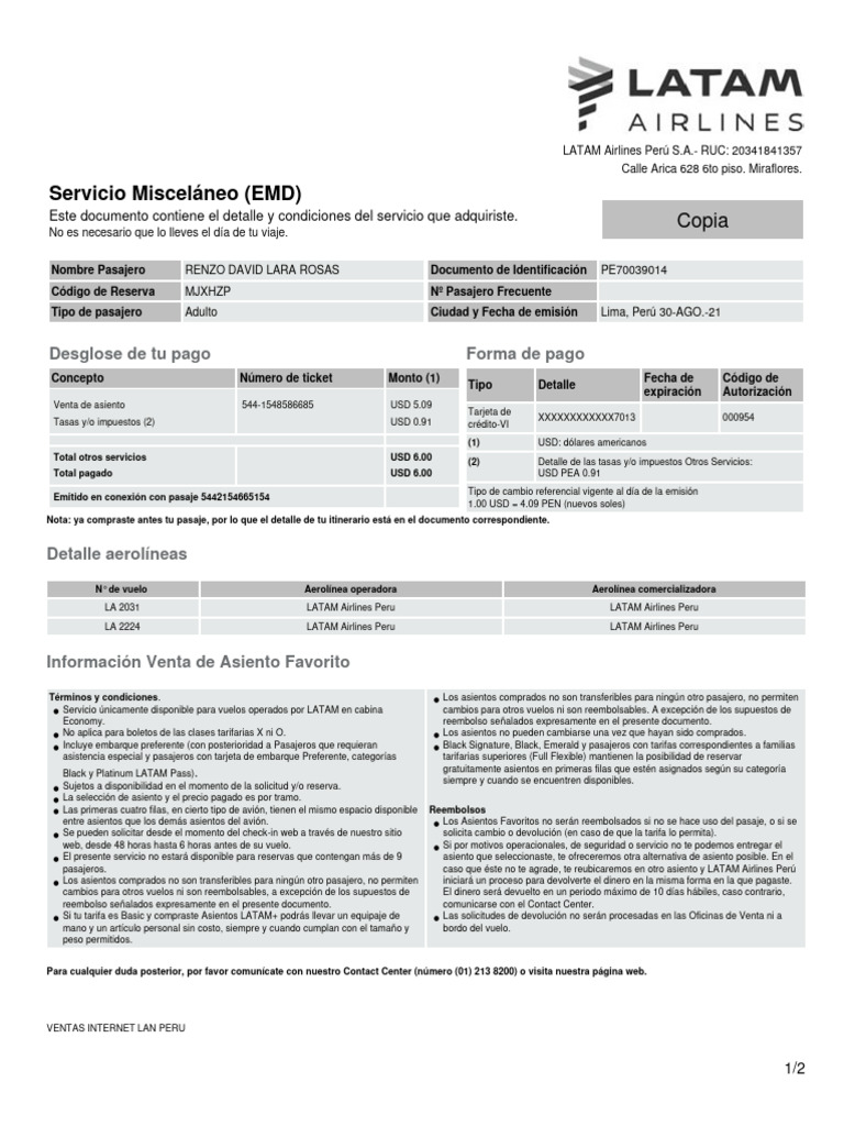 Nombre Pasajero RENZO DAVID LARA ROSAS Documento de Identificación PE70039014
