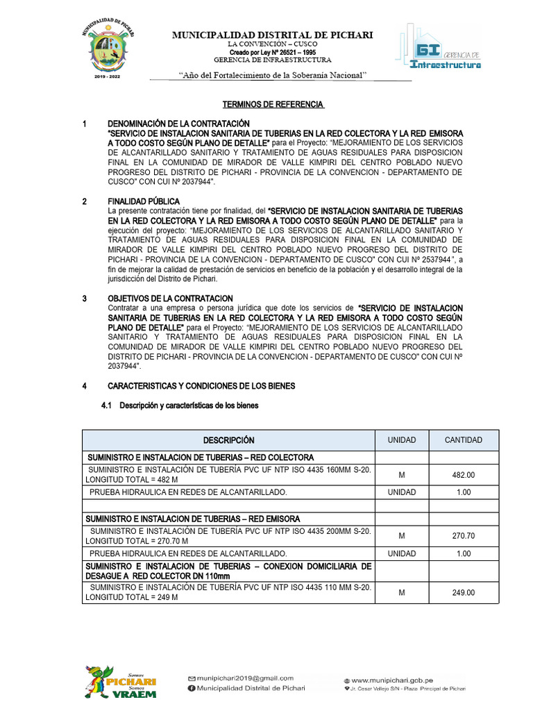 La presente contratación tiene por finalidad, del “SERVICIO DE INSTALACION SANITARIA DE TUBERIAS