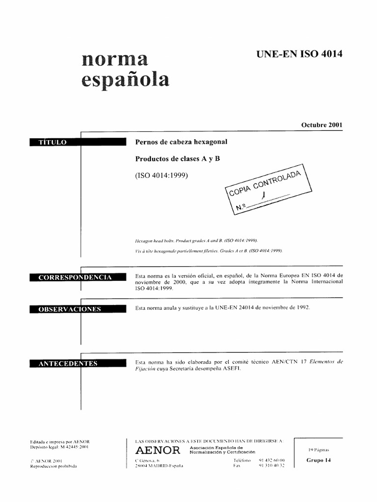 El texto de la Norma Internacional ISO 4014:1999 ha sido aprobido por CEN como norma europea sin