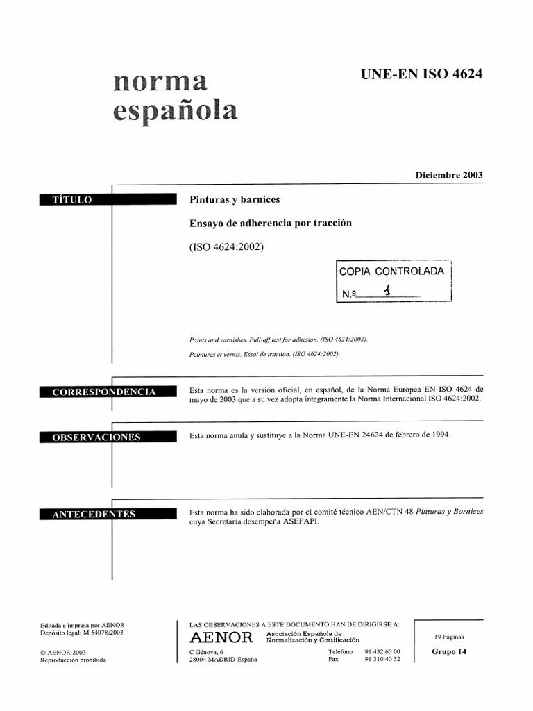 EN ISO 4624:2003 por el Comité Técnico CEN/TC 139 Pinturas y barnices, cuya Secretaria desempena