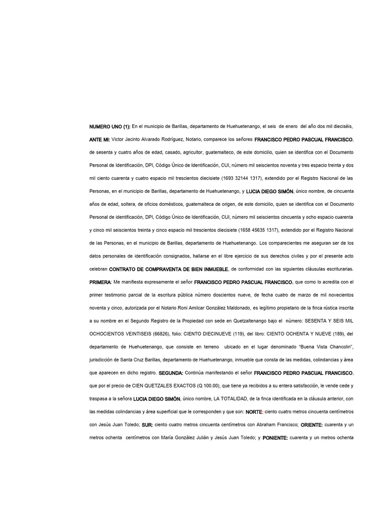NUMERO UNO (1): En el municipio de Barillas, departamento de Huehuetenango, el seis de enero del año dos mil dieciséis,