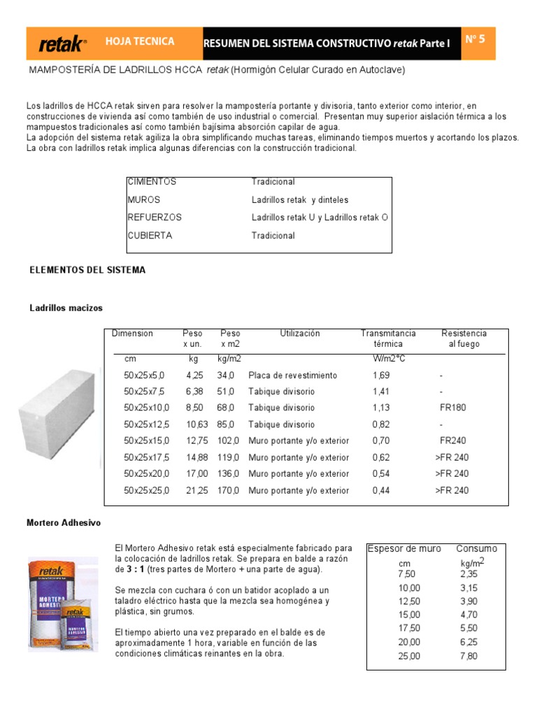 Ladrillos macizos Dimension cm 50x25x5,0 50x25x7,5 50x25x10,0 50x25x12,5 50x25x15,0 50x25x17,5 50x25x20,0 50x25x25,0 Mortero Adhesivo El Mortero Adhesivo retak est especialmente fabricado para la colocacin de ladrillos retak. Se prepara en balde a razn de 3 : 1 (tres partes de Mortero + una parte de agua). Se mezcla con cuchara con un batidor acoplado a un taladro elctrico hasta que la mezcla sea homognea y plstica, sin grumos. El tiempo abierto una vez preparado en el balde es de aproximadamente 1 hora, variable en funcin de las condiciones climticas reinantes en la obra. Peso x un. kg 4,25 6,38 8,50 10,63 12,75 14,88 17,00 21,25 Peso x m2 kg/m2 34,0 51,0 68,0 85,0 102,0 119,0 136,0 170,0 Placa de revestimiento Tabique divisorio Tabique divisorio Tabique divisorio Muro portante y/o exterior Muro portante y/o exterior Muro portante y/o exterior Muro portante y/o exterior Utilizacin Transmitancia trmica W/m2C 1,69 1,41 1,13 0,82 0,70 0,62 0,54 0,44 FR180 FR240 >FR 240 >FR 240 >FR 240 Resistencia al fuego