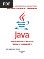 Captulo 1 ...................................................................................................................................... 8 1. Historia de Java ......................................................................................................................... 9 2. Caractersticas ........................................................................................................................... 9 3. Programando en Bloc de notas ............................................................................................... 11 4. Fundamentos para escribir en Java ......................................................................................... 16 4.1. Tipos de variables............................................................................................................. 17 4.2. Peticiones de valores al usuario ....................................................................................... 23 4.2.1. Instrucciones condicionales y de repeticin .............................................................. 23 CAPTULO 2 ................................................................................................................................. 32 5 Objetos ..................................................................................................................................... 33 5.1. Instanciacin de Objetos: ................................................................................................. 33 6. Clases ....................................................................................................................................... 33 7. Netbeans IDE ........................................................................................................................... 35 7.1. Preparando el rea de trabajo ........................................................................................... 36 8. Referencias .............................................................................................................................. 41 9. Tipos de acceso ....................................................................................................................... 41 Ejercicios...................................................................................................................................... 42 Ayudas al Usuario ........................................................................................................................ 44 Capitulo 3 .................................................................................................................................... 48 13. Polimorfismo ......................................................................................................................... 51 14. Clases abstractas ................................................................................................................... 51 15. Interfaces............................................................................................................................... 51 15.1. Excepciones.................................................................................................................... 52 15.1.1. Bloques Try-Catch. ................................................................................................. 54 16. JOptionPane .......................................................................................................................... 55 Ejemplos ...................................................................................................................................... 58 Ejercicio ....................................................................................................................................... 65 Ayudas al usuario ........................................................................................................................ 66 Capitulo 4 .................................................................................................................................... 69 17. Componentes de una interfaz grafica con el usuario ........................................................... 70 17.1. Componentes y contenedores ......................................................................................... 71 17.1.1. Acciones sobre los componentes ............................................................................. 72 5