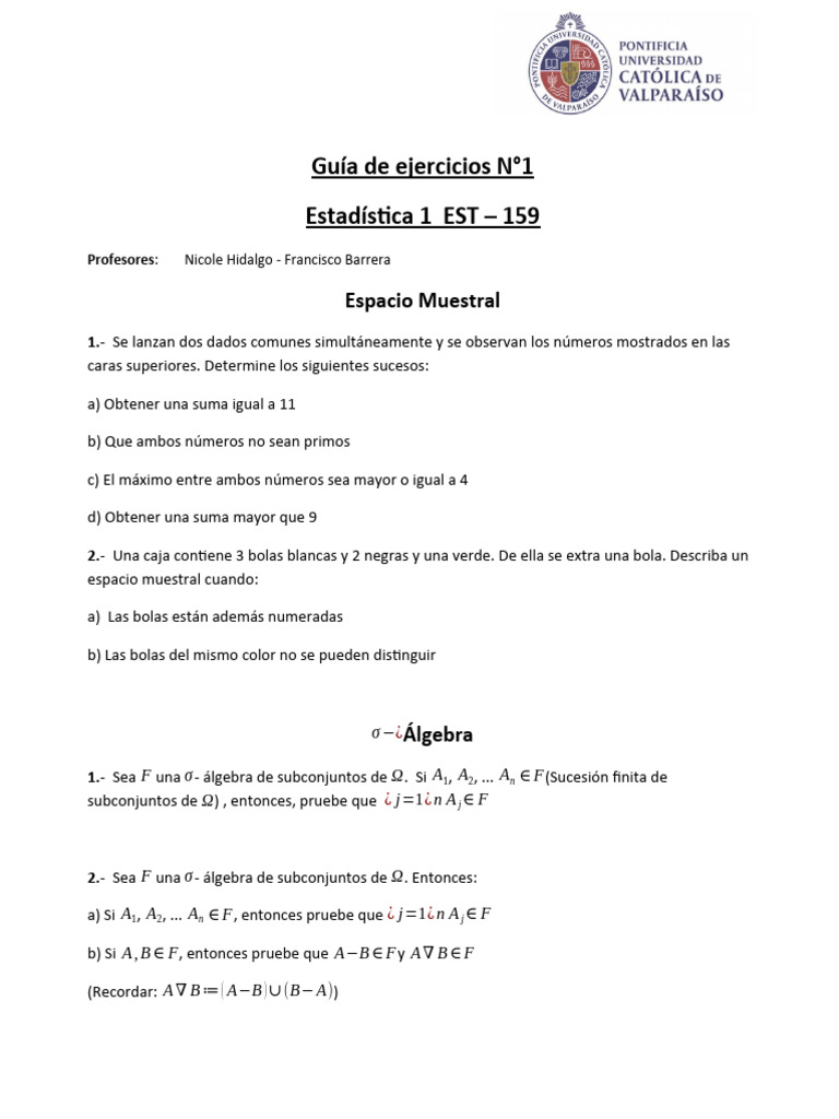 1.- Sea F una σ - álgebra de subconjuntos de Ω . Si A1, A2, ... An ∈ F (Sucesión finita de