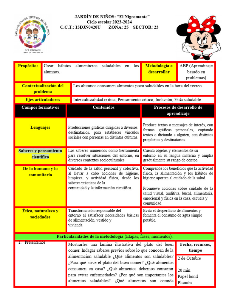 Propósito: Crear hábitos alimenticios saludables en los Metodología a ABP (Aprendizaje