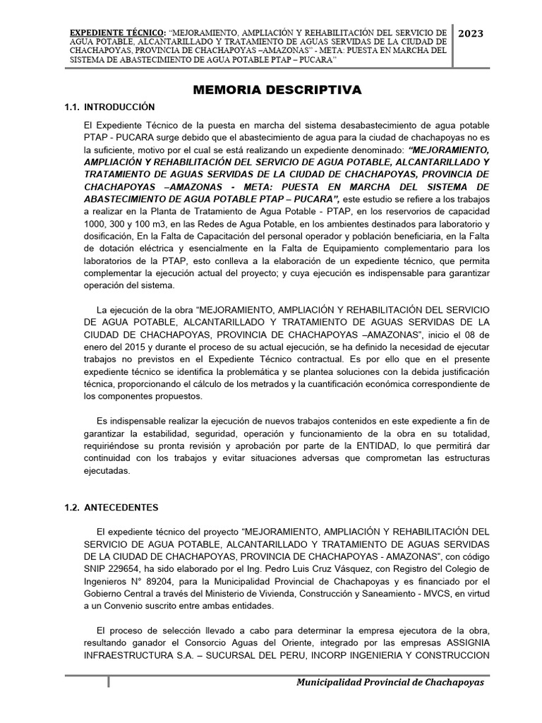 El Expediente Técnico de la puesta en marcha del sistema desabastecimiento de agua potable
