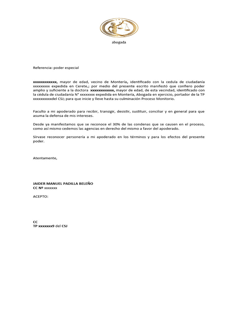 la cédula de ciudadanía N° xxxxxxxx expedida en Montería, Abogada en ejercicio, portador de la TP