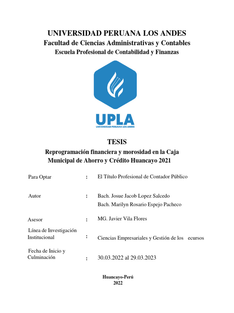 Municipal de Ahorro y Crédito Huancayo 2021”. Presenta como problema que la morosidad
