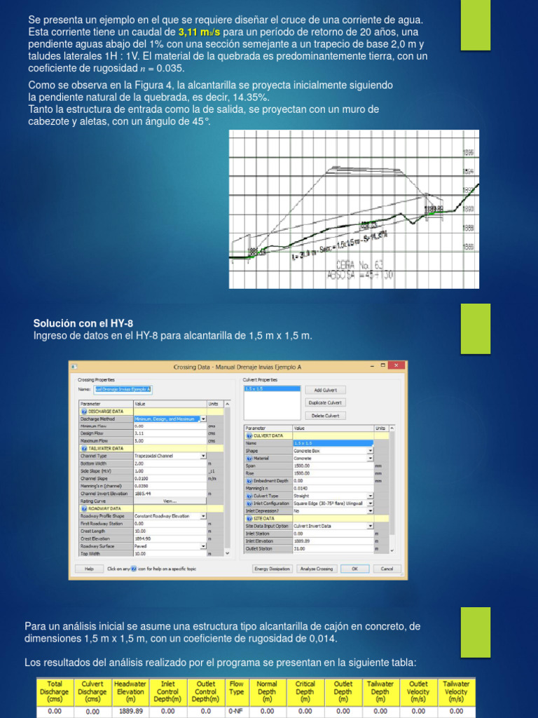 Ingreso de datos en el HY-8 para alcantarilla de 1,5 m x 1,5 m.