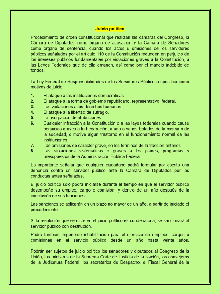Si la resolución que se dicte en el juicio político es condenatoria, se sancionará al