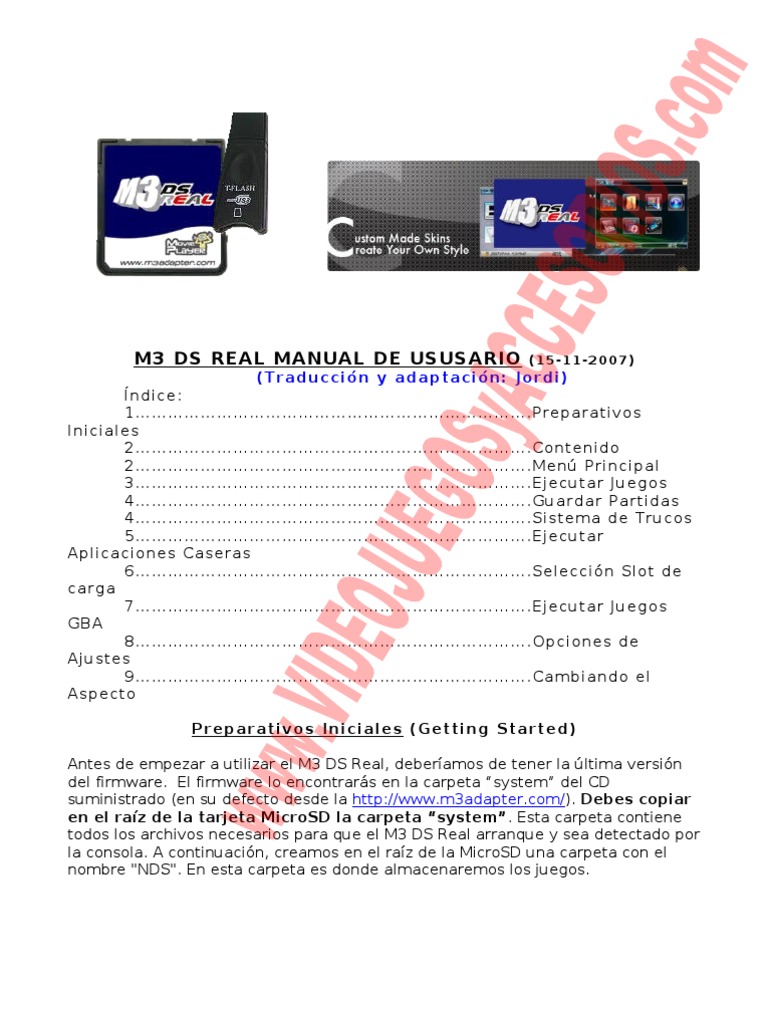 (Traduccin y adaptacin: Jordi) ndice: 1.Preparativos Iniciales 2.Contenido 2.Men Principal 3.Ejecutar Juegos 4.Guardar Partidas 4.Sistema de Trucos 5.Ejecutar Aplicaciones Caseras 6.Seleccin Slot de carga 7.Ejecutar Juegos GBA 8.Opciones de Ajustes 9.Cambiando el Aspecto Preparativos Iniciales (Getting Started) Antes de empezar a utilizar el M3 DS Real, deberamos de tener la ltima versin del firmware. El firmware lo encontrars en la carpeta system del CD suministrado (en su defecto desde la http://www.m3adapter.com/). Debes copiar en el raz de la tarjeta MicroSD la carpeta system. Esta carpeta contiene todos los archivos necesarios para que el M3 DS Real arranque y sea detectado por la consola. A continuacin, creamos en el raz de la MicroSD una carpeta con el nombre "NDS". En esta carpeta es donde almacenaremos los juegos.