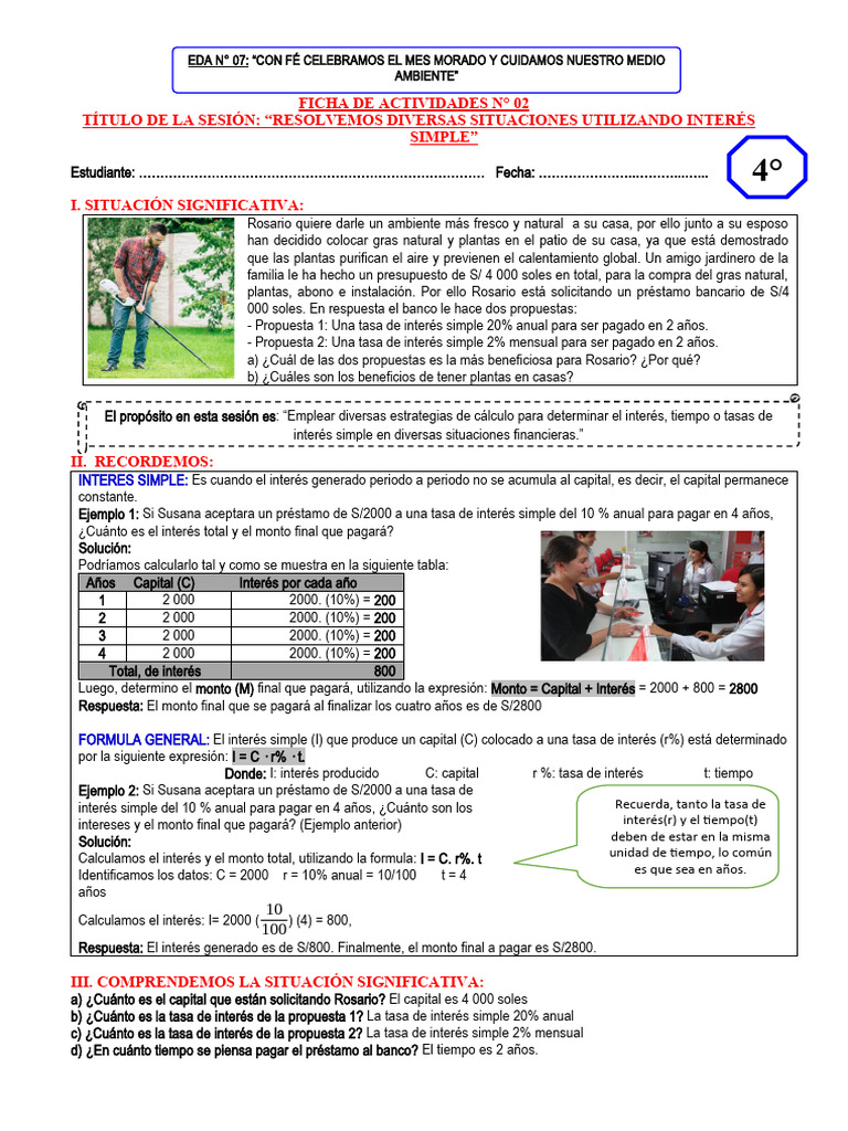 TÍTULO DE LA SESIÓN: “RESOLVEMOS DIVERSAS SITUACIONES UTILIZANDO INTERÉS