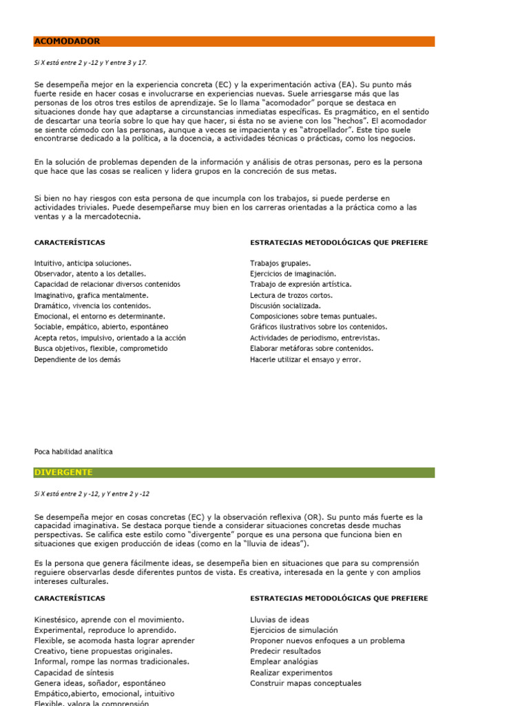 Se desempeña mejor en cosas concretas (EC) y la observación reflexiva (OR). Su punto más fuerte es la