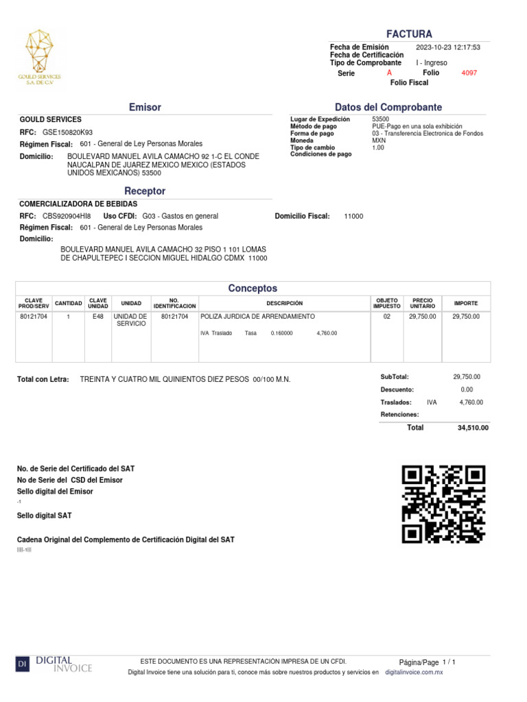 Total con Letra: TREINTA Y CUATRO MIL QUINIENTOS DIEZ PESOS 00/100 M.N. SubTotal: 29,750.00