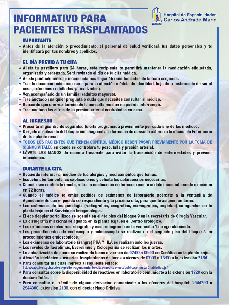 Atención telefónica a usuarios trasplantados de lunes a viernes de 07:00 a 15:00 a la extensión 2184.