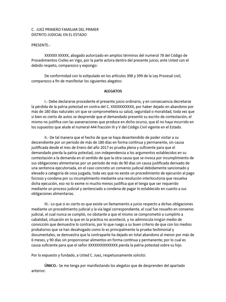 ÚNICO.- Se me tenga por manifestando los alegatos que de desprenden del apartado