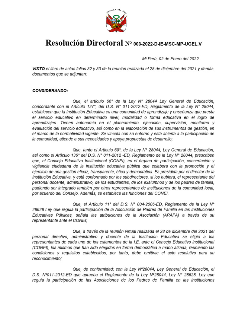 Resolución Directoral N° 003-2022-D-IE-MSC-MP-UGEL.