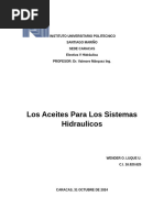 Aceites para Sistemas Hidrulicos Los sistemas hidrulicos se utilizan en innumerables aplicaciones industriales, sea como transmisores de fuerza o como elementos de control. Podemos dar como ejemplo las prensas hidrulicas, elementos hidrulicos de mquinas herramientas, en trasmisin hidrulica, etc. La correcta eleccin del aceite a usar en un sistema hidrulico es muy importante para el buen funcionamiento del mismo, pues se obtendr una ms rpida aplicacin de la carga, facilidad del control de la velocidad de aplicacin de dicha carga y permitir un rpido incremento o cambio de direccin de la fuerza. Se enumerar a continuacin las propiedades ms importantes requeridas en un aceite hidrulico y la influencia que cada una de ellas tiene en la performance de estos sistemas. Viscosidad Es de suma importancia que el aceite posea la viscosidad apropiada a la temperatura de trabajo. Es conocido el hecho de que la viscosidad vara con la temperatura, determinando que un aceite sea menos viscoso cuando se lo calienta, espesndose cuando es enfriado. En primer lugar estos fluidos deben lubricar elementos mviles que usualmente estn diseados con tolerancias estrictas, por lo que el lubricante deber poseer la viscosidad adecuada para este propsito. Adems, el aceite necesita tener la suficiente viscosidad como para producir un cierre hermtico. Por otra parte, la viscosidad del aceite no deber ser tan elevada como para provocar resistencias innecesarias, pues si stas son muy grandes, se producir un gasto intil de energa. En otras palabras, existe un lmite superior e inferior para la viscosidad requerida en un sistema hidrulico y la eleccin del lubricante debe hacerse dentro de un ajustado rango de viscosidades. Los ambientes fros determinan una condicin adicional de viscosidad, por tal motivo es que para ciertos equipos se especifica una viscosidad mxima para la menor temperatura de arranque. ndice de Viscosidad Asociado con la viscosidad est el ndice de viscosidad (I.V.) que nos indica la mayor o menor variacin de la viscosidad del aceite con los cambios de temperatura. A mayor I.V. menor variacin de la viscosidad, con cambio de la temperatura. Por lo tanto, en todo sistema hidrulico con amplias variaciones de temperatura, se debe recurrir a aceites de alto I.V., de manera de mantener un rango de viscosidad ptimo a todas las temperaturas de operacin. Estabilidad a la oxidacin Comparable en importancia a la viscosidad, es la estabilidad a la oxidacin del aceite. Esta propiedad da un ndice de la resistencia del aceite a las deteriorizaciones qumicas que se producen cuando se encuentra en presencia de aire, manifestndose generalmente en la formacin de lodos perjudiciales. A este respecto, algunos aceites tienen mayor resistencia al deterioro que otros, esta cualidad depende de la seleccin de la base lubricante, de los procesos de refinanciacin y de la adicin adecuada de inhibidores de oxidacin. Los daos causados por la oxidacin pueden interferir seriamente en la performance de un sistema hidrulico, pues los productos generados pueden llegar a trabar el accionamiento normal de las vlvulas y a taponar las lneas y filtros, siendo su reparacin una operacin engorrosa y costosa. La oxidacin de un aceite es una reaccin que progresa con el tiempo, lentamente al comienzo, para luego ir incrementndose hacia el fin de la vida til del aceite. Las altas temperaturas aceleran este proceso, como as tambin la presencia de ciertos metales (cobre) que actan como catalizadores. La vida en servicio del aceite depende en gran parte de su capacidad para resistir esta accin, surgiendo as la necesidad de que los aceites para sistemas hidrulicos tengan como requisito muy importante un buena estabilidad a la oxidacin. Punto de escurrimiento Cuando la temperatura ambiente o la temperatura inicial es baja, se debe tener la seguridad de que el aceite fluir y alimentar adecuadamente la succin de la bomba. El punto de escurrimiento de un aceite es la ms baja temperatura a la cual escurre el mismo. Prcticamente todos los aceites de petrleo tienen componentes parafnicos que son deseables desde el punto de vista del lubricante, pues aumentan el I.V. del aceite y su resistencia a la oxidacin; sin embargo, a bajas temperaturas estos componentes tienden a cristalizarse, formando una malla que impide la circulacin del aceite. Existen aceites de bajo punto de escurrimiento natural, mientras que otros, especialmente los de alto I.V. poseen un mayor punto de escurrimiento por lo que a stos se les adiciona aditivos depresores del punto de escurrimiento. En el caso de aceites hidrulicos, el aceite elegido debe tener un punto de escurrimiento ms bajo que la ms baja temperatura ambiente a la cual debe operar el sistema hidrulico. Demulsibilidad El agua que pudiera estar presente en estos sistemas es producida por la condensacin de la humedad ambiente. Si el aceite posee buenas caractersticas de demulsibilidad, ste resistir la formacin de emulsin con el agua, separndose rpidamente de la misma para permitir su drenado desde el fondo del depsito. Debido al efecto corrosivo del agua sobre los metales, una buena demulsibilidad es una propiedad necesaria en los aceites para sistemas hidrulicos, permitiendo prolongar la vida til del equipo. Prevencin contra la herrumbre Es de desear que en todo momento no exista agua dentro del sistema hidrulico, pues an bajo las condiciones ms favorables, siempre existe la posibilidad de oxidacin. El xido formado puede producir incrustaciones en tuberas, provocando el taponamiento de las mismas o el daado de las vlvulas, adems del rayado de las superficies en contacto. Asimismo los vstagos de los mbolos estn expuestos algunas veces directamente al aire y cualquier picado de sus superficies pulidas
