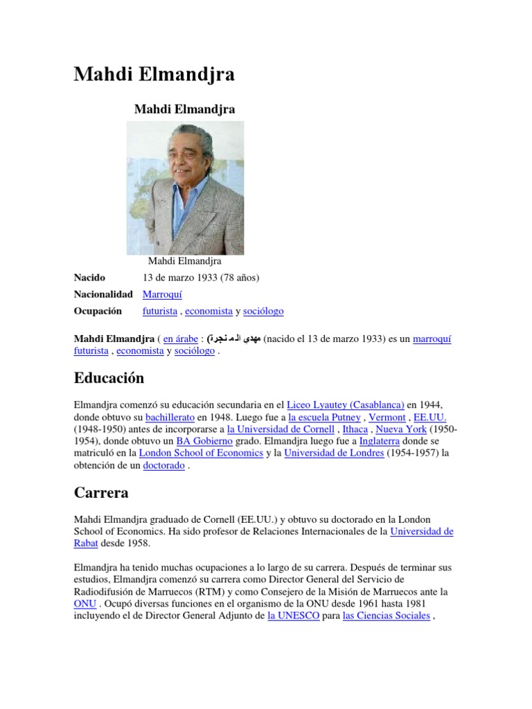 Mahdi Elmandjra Nacido Ocupacin 13 de marzo 1933 (78 aos) futurista , economista y socilogo Nacionalidad Marroqu