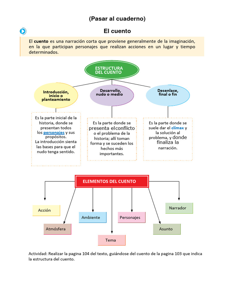 Actividad: Realizar la pagina 104 del texto, guiándose del cuento de la pagina 103 que indica