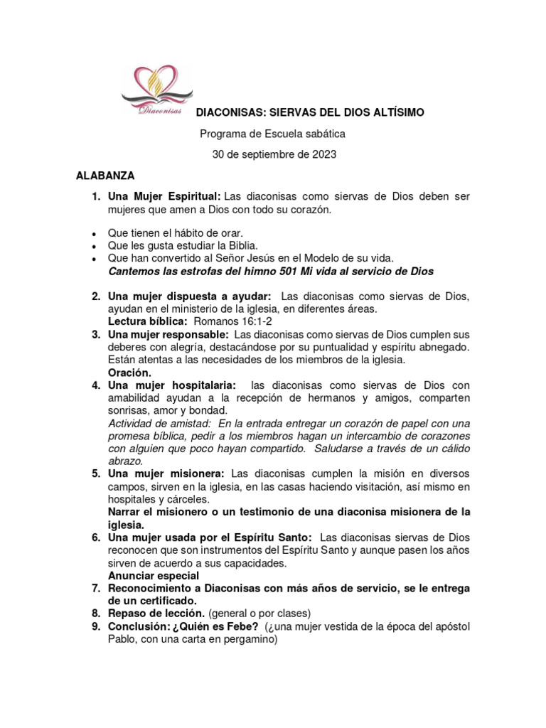 diaconisas junto a mí, porque quiero orar por ustedes para que sean siervas