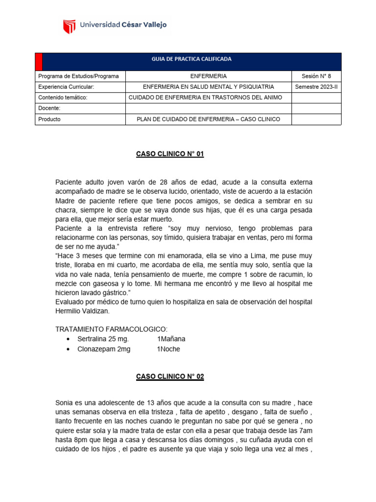 Experiencia Curricular: ENFERMERIA EN SALUD MENTAL Y PSIQUIATRIA Semestre 2023-II