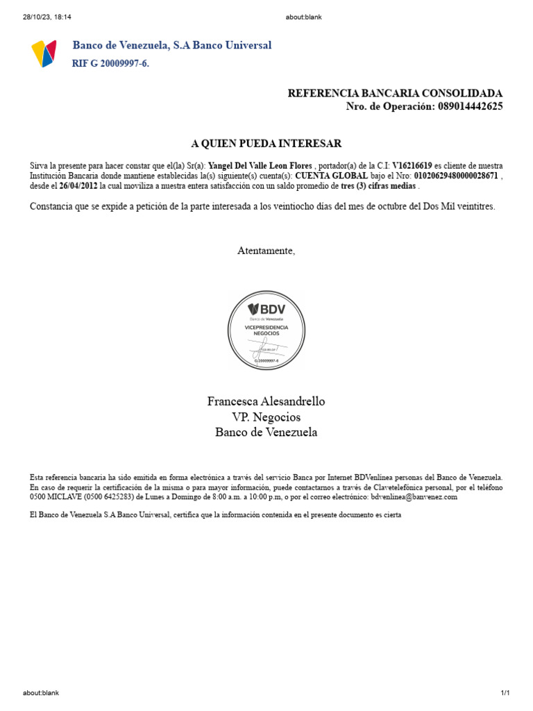 Esta referencia bancaria ha sido emitida en forma electrónica a través del servicio Banca por Internet BDVenlínea personas del Banco de Venezuela.