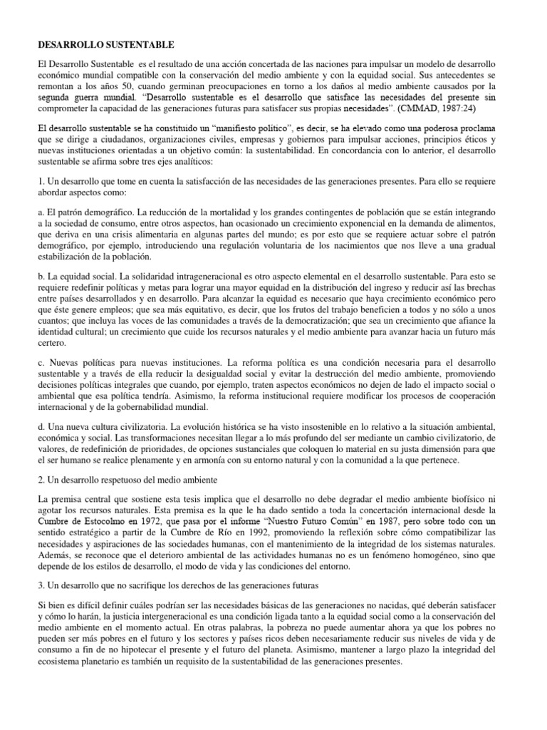 1. Un desarrollo que tome en cuenta la satisfacción de las necesidades de las generaciones presentes. Para ello se requiere