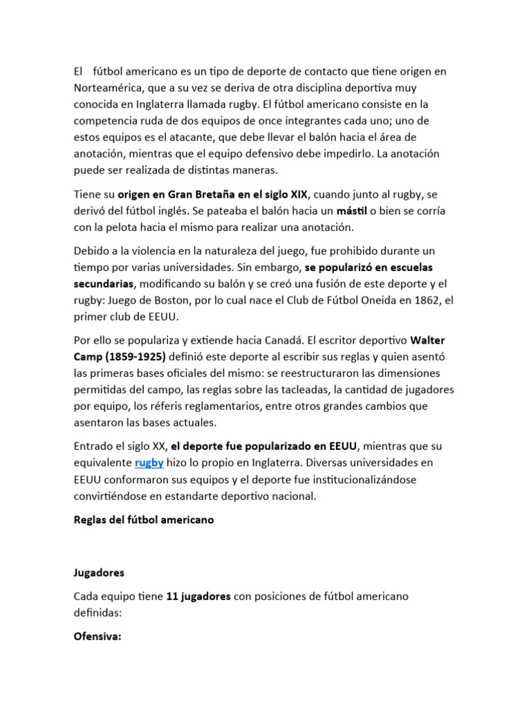 conocida en Inglaterra llamada rugby. El fútbol americano consiste en la
