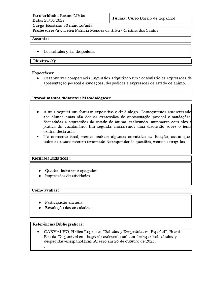 CARVALHO, Hellen Lopes de. "Saludos y Despedidas en Español"; Brasil