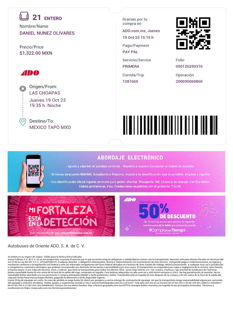cancelable boleto abordado y/o con promoción o compra anticipada (debido a tarifa preferente). Boleto Transferible sólo en taquilla 60 min después de la compra y 30 min antes de la hora de la salida del