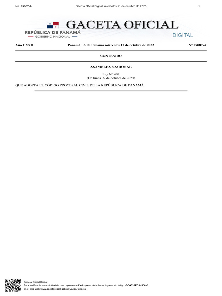 Artículo Único. Se adopta el Código Procesal Civil de la República de Panamá, cuyo texto es el