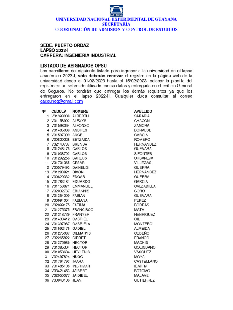 Los bachilleres del siguiente listado para ingresar a la universidad en el lapso