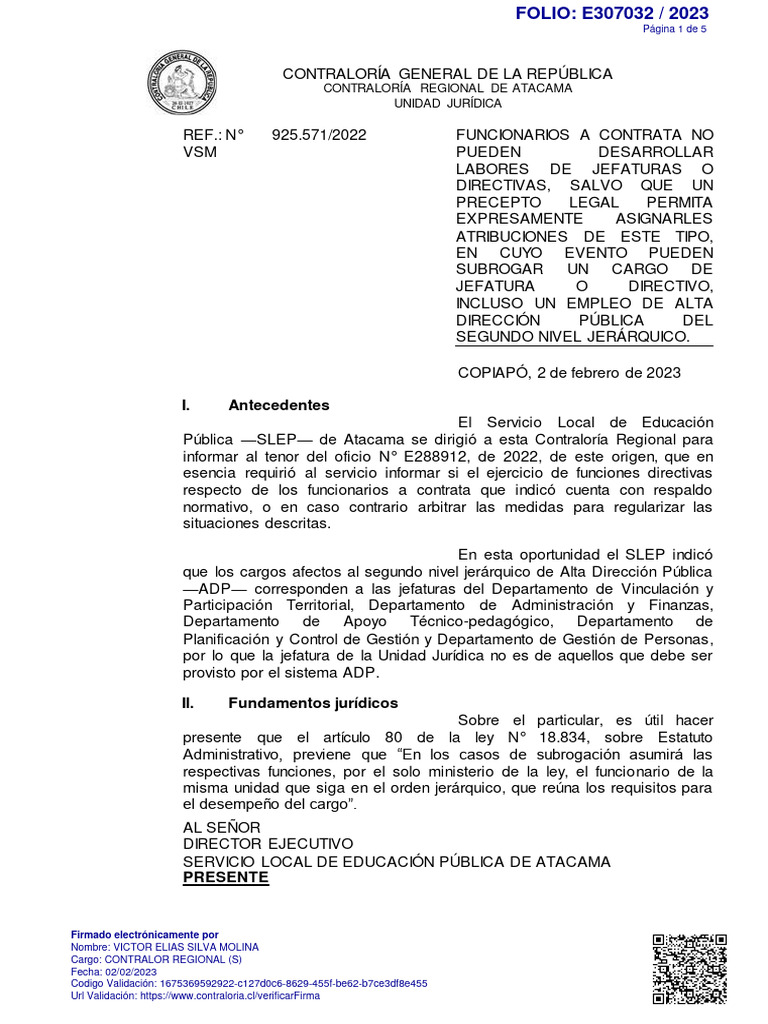 jefatura de la Unidad Jurídica del SLEP de Atacama, si bien este es un cargo