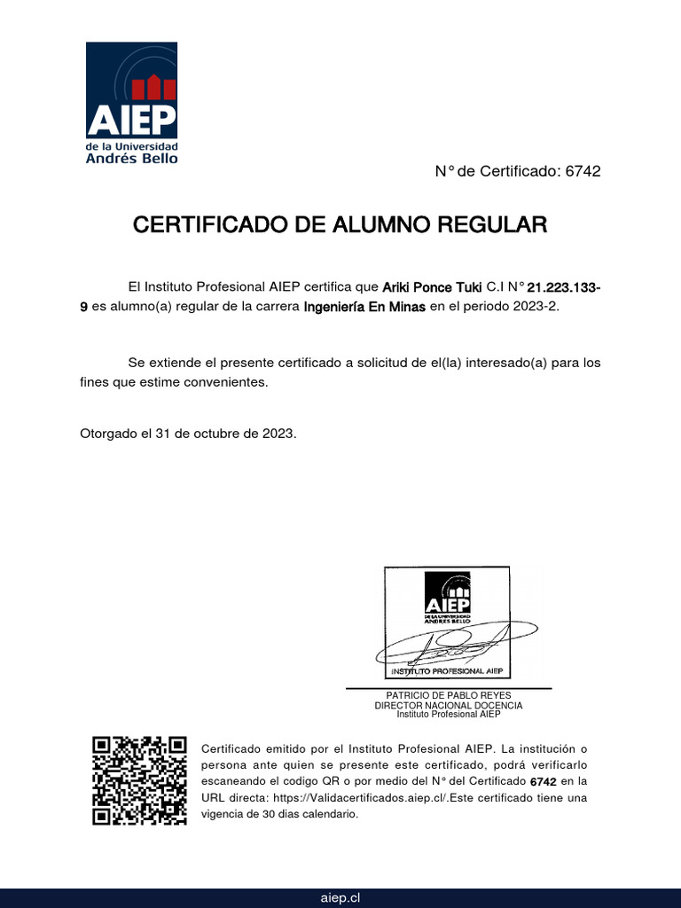 El Instituto Profesional AIEP certifica que Ariki Ponce Tuki C.I N° 21.223.133-