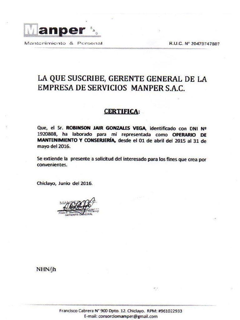 ‘Que, Ja Sr. Robinson Jair Gonzales Vega, identificada con DNI N.” 71920808, ha laborado