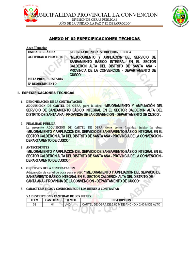 DE CARTEL DE OBRA a cargo del proveedor y recepció n del bien en un solo pago, previa conformidad