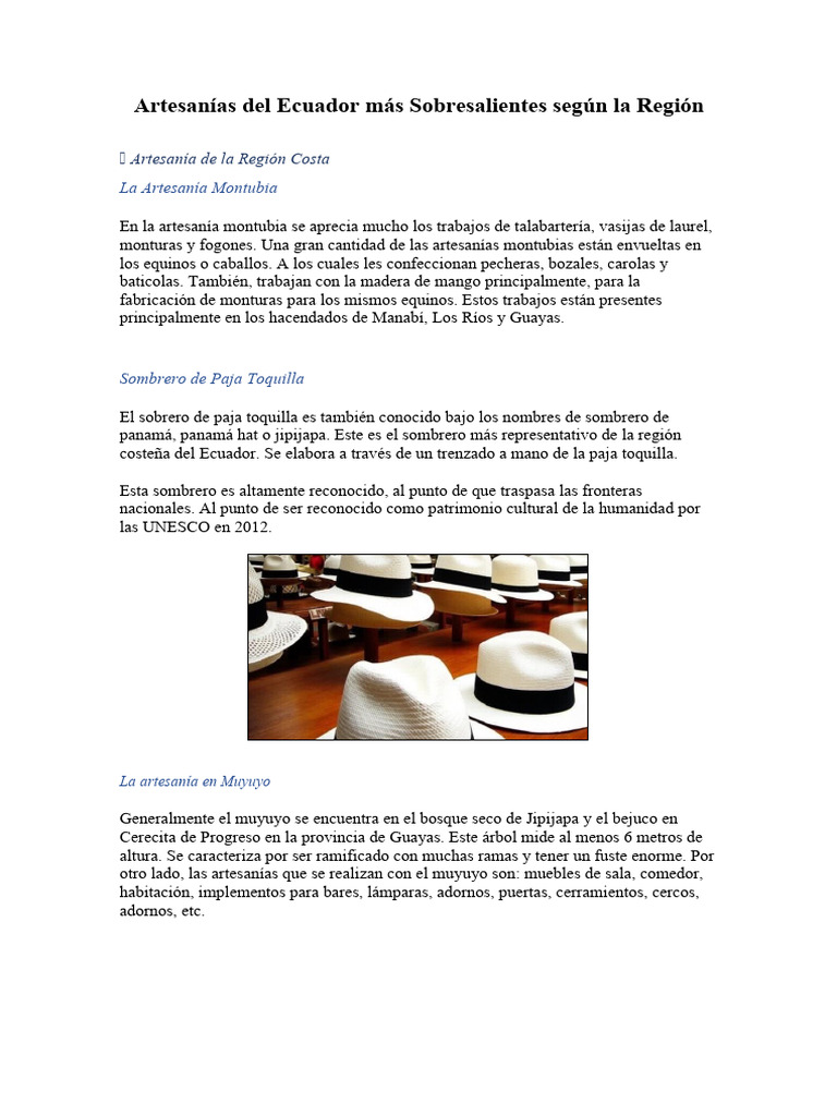 costeña del Ecuador. Se elabora a través de un trenzado a mano de la paja toquilla.