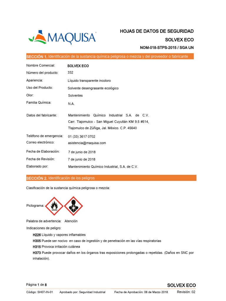 Datos del fabricante: Mantenimiento Químico Industrial S.A. de C.V.