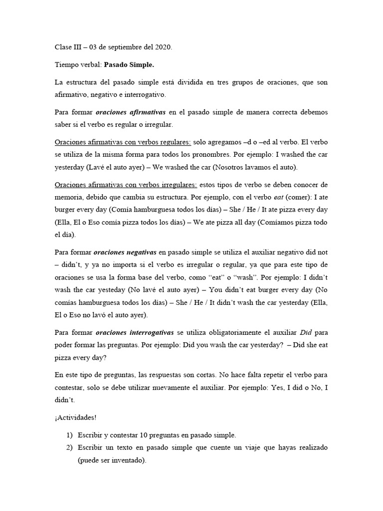 2) Escribir un texto en pasado simple que cuente un viaje que hayas realizado