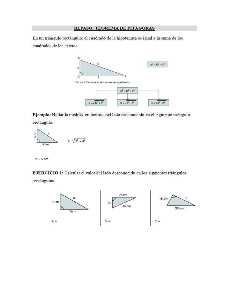 EJERCICIO 1: Calcular el valor del lado desconocido en los siguientes triángulos