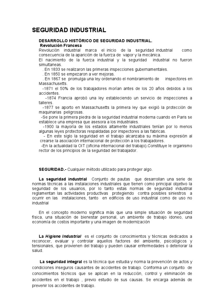 DESARROLLO HISTRICO DE SEGURIDAD INDUSTRIAL. Revolucin Francesa Revolucin industrial marca el inicio de la seguridad industrial como consecuencia de la aparicin de la fuerza de vapor y la mecnica. El nacimiento de la fuerza industrial y la seguridad industrial no fueron simultaneas. . En 1833 se realizaron las primeras inspecciones gubernamentales. . En 1850 se empezaron a ver mejoras. . En 1867 se promulga una ley ordenando el nombramiento de inspectores en Massachusetts. -1871 el 50% de los trabajadores moran antes de los 20 aos debidos a los accidentes. -1874 Francia aprob una ley estableciendo un servicio de inspecciones a talleres. -1877 se aporto en Massachusetts la primera ley que exigi la proteccin de maquinarias peligrosas. -Se pone la primera piedra de la seguridad industrial moderna cuando en Paris se establece una empresa que asesora a los industriales. -1900 la mayora de los estados altamente industriales tenan por lo menos algunas leyes protectoras respaldadas por inspectores a las fabricas. - En este siglo la seguridad en el trabajo alcanzaba su mxima expresin al crearse la asociacin internacional de proteccin a los trabajadores. -En la actualidad la OIT (oficina internacional del trabajo).Constituye le organismo rector de los principios de la seguridad del trabajador.